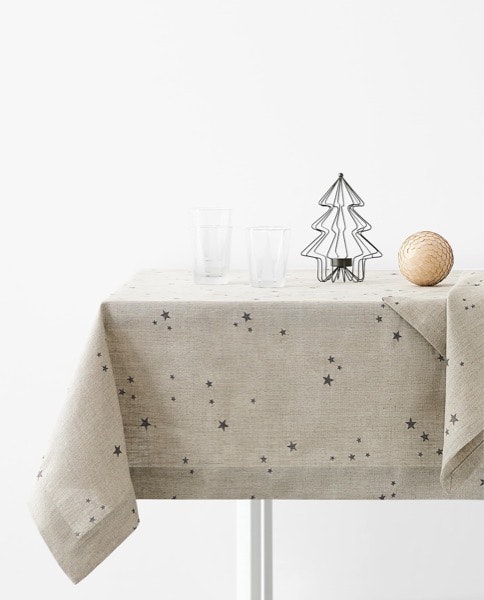 Tela em branco | Não é em branco mas é em cru - e vem com umas estrelinhas! Apostar numa toalha com cores menos folclóricas deixa-nos espaço para ousar mais na decoração da mesa. | Toalha de mesa Zara Home, 59,99€