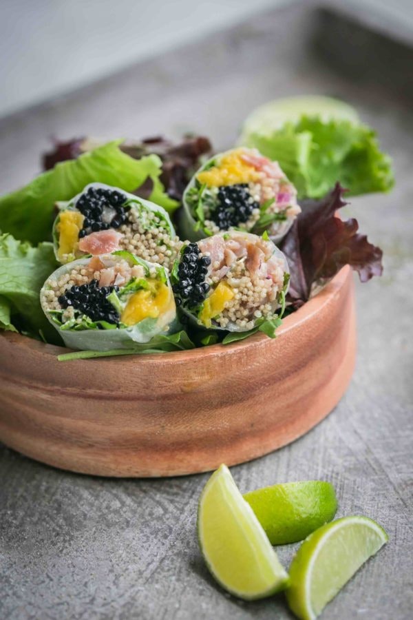 Preparação: Com a ajuda de um passador de rede lave muito bem a quinoa, até que fique totalmente límpida. Coloque de seguida ao lume numa panela com um fio de azeite. E para 1 copo de quinoa coloque o dobro da água, sal e sumo de lima. Deixe cozinhar por 15 minutos. A quinoa tem que ficar macia e sem água. Para preparar o wrap, passe a folha de arroz por água quente cerca de 15 segundos e coloque-a sobre uma superfície lisa. Coloque ao centro, de um extremo ao outro, as finas fatias de carpaccio, as folhas de alface, as 3 colheres quinoa e as fatias de manga. Deixe cair as raspas de lima e finalize com o caviar. Passe com o moinho do sal. Por fim dobre as pontas e enrole a folha de arroz sobre si propria. Corte em duas partes iguais. Repita o número de vezes necessárias. Sirva os wraps num bowl.