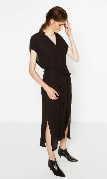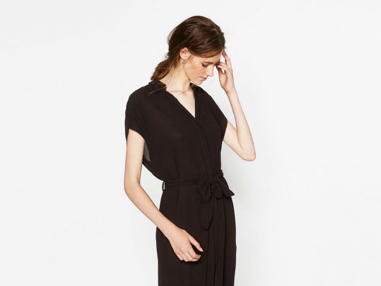 A sugestão desta semana é da Zara. Conjugámos um vestido túnica, em preto, largo e esvoaçante (o que o torna ideal para o tempo mais quente) com uns sapatos rasos bem simples, em rosa claro.